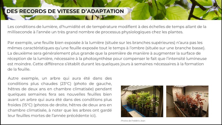 Penser le futur des forêts nécessite donc d’anticiper l’évolution attendue du climat, en tenant compte des incertitudes, mais également de prendre en compte les capacités d’adaptation propres à chaque arbre au cours de sa vie. Le fonctionnement d’un arbre dépend des conditions dans lesquelles il se trouve, il peut s’ajuster en quelques minutes à un changement de luminosité par exemple.