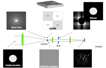 © copyright Rouan/Daniel/2015 Principe du coronographe quatre-quadrants, dispositif optique qui permet de masquer la lumière d’une étoile pour révéler son entourage immédiat, comme une planète.